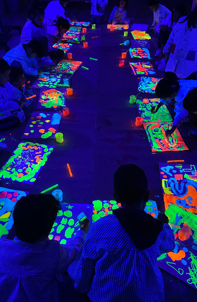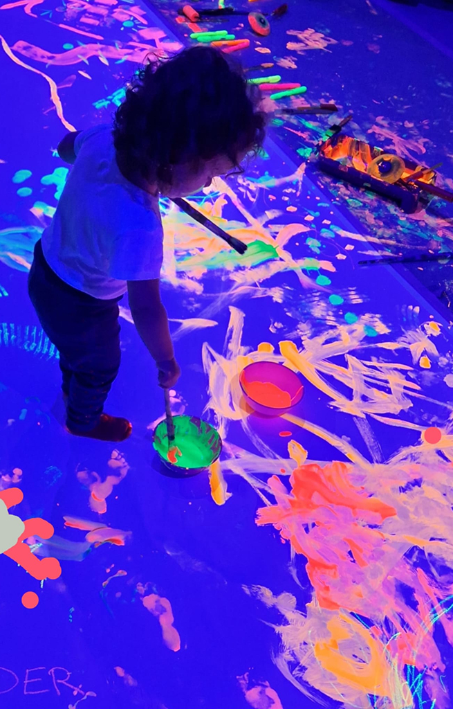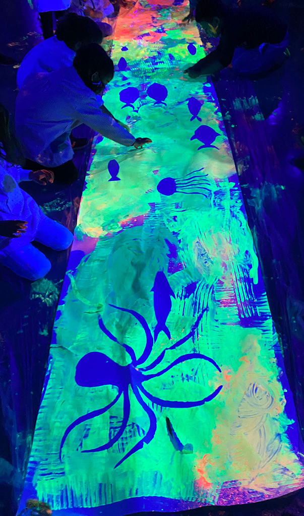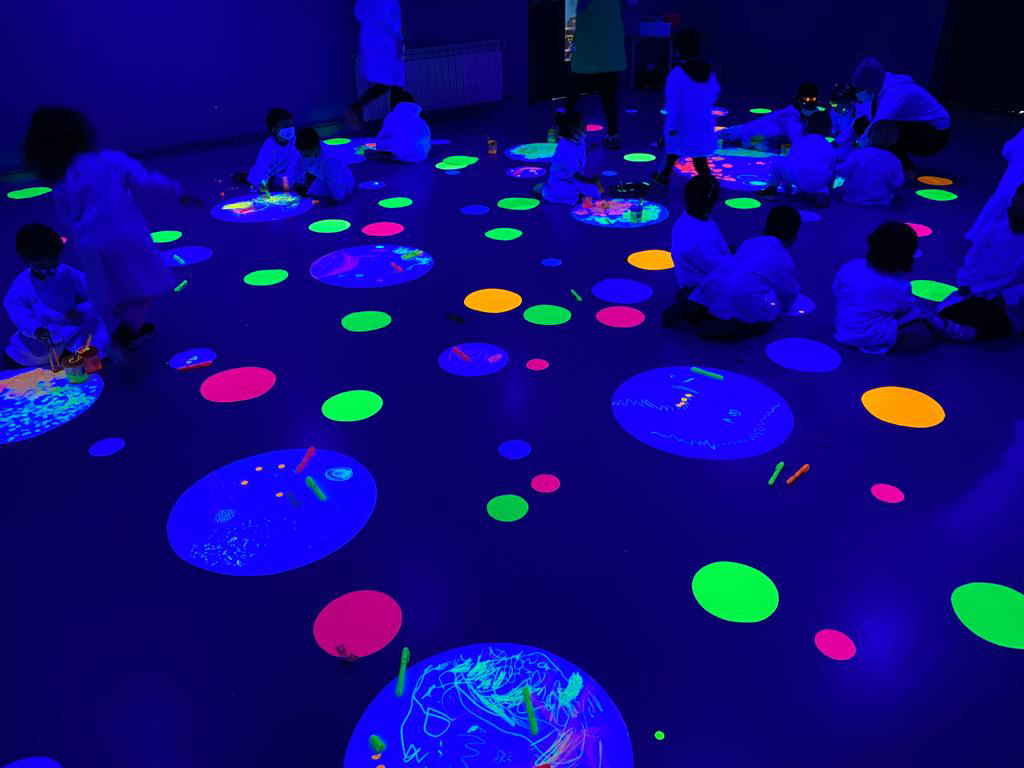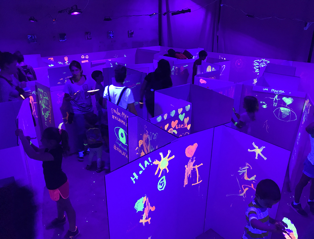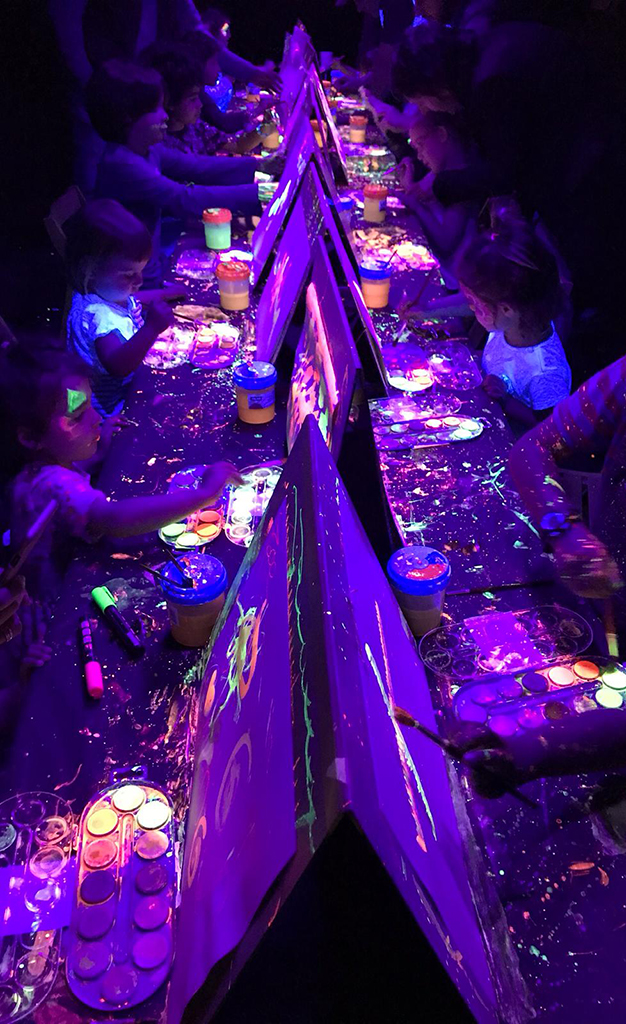 En aquest taller els colors fluorescents brillen en la foscor gràcies a focus de llum ultraviolada. La proposta pot ser molt diversa; murals col·lectius, laberints, pintura amb cavallets, instal·lacions per pintar per a una celebració concreta…