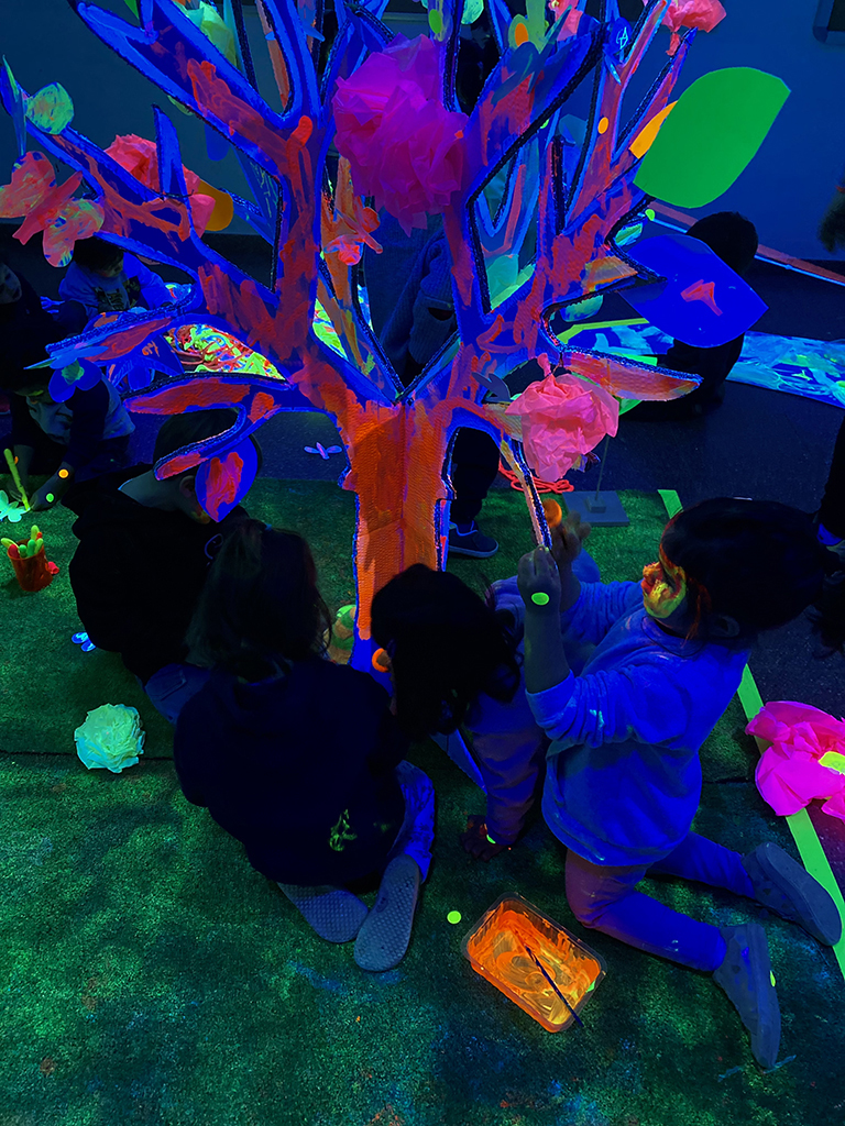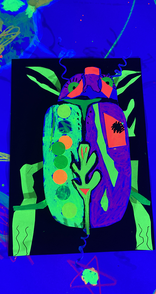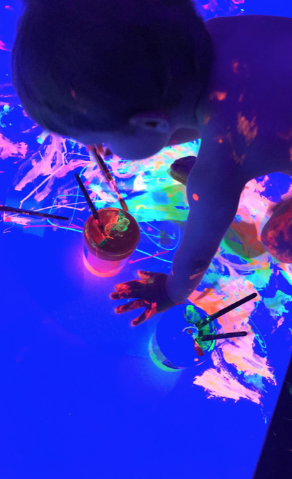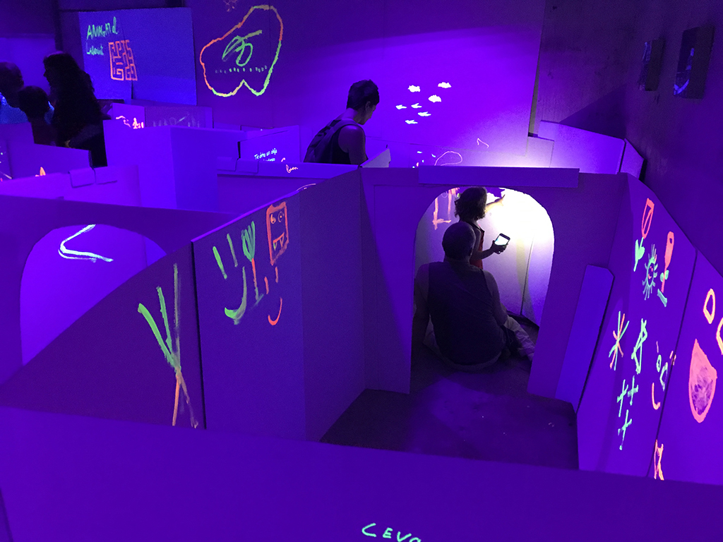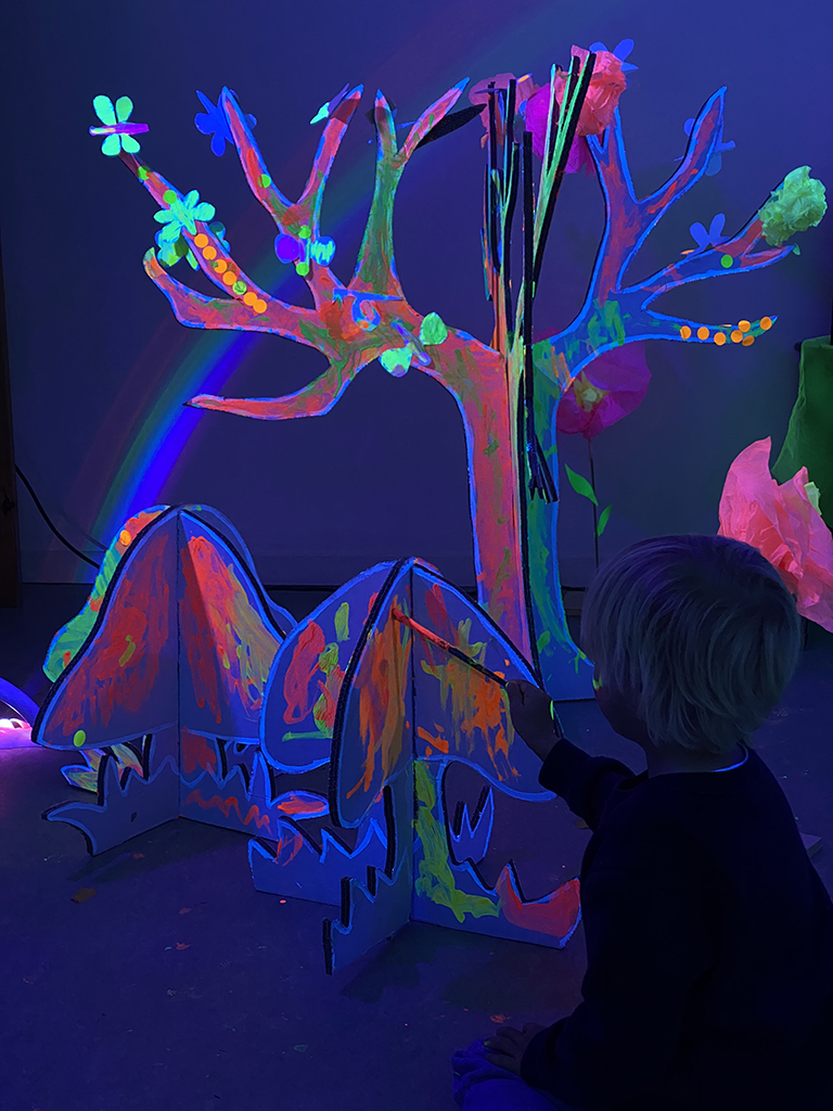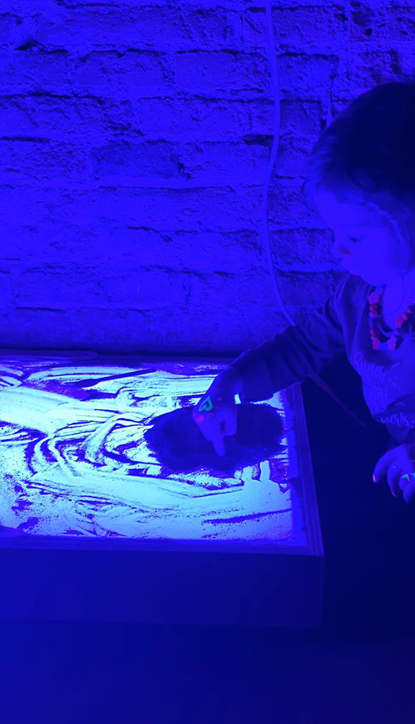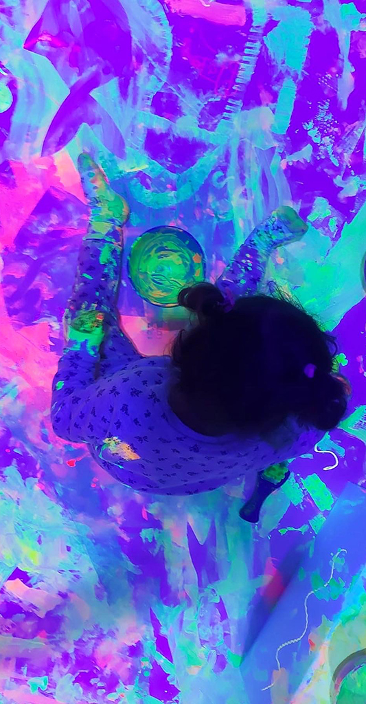 En aquest taller els colors fluorescents brillen en la foscor gràcies a focus de llum ultraviolada. La proposta pot ser molt diversa; murals col·lectius, laberints, pintura amb cavallets, instal·lacions per pintar per a una celebració concreta…